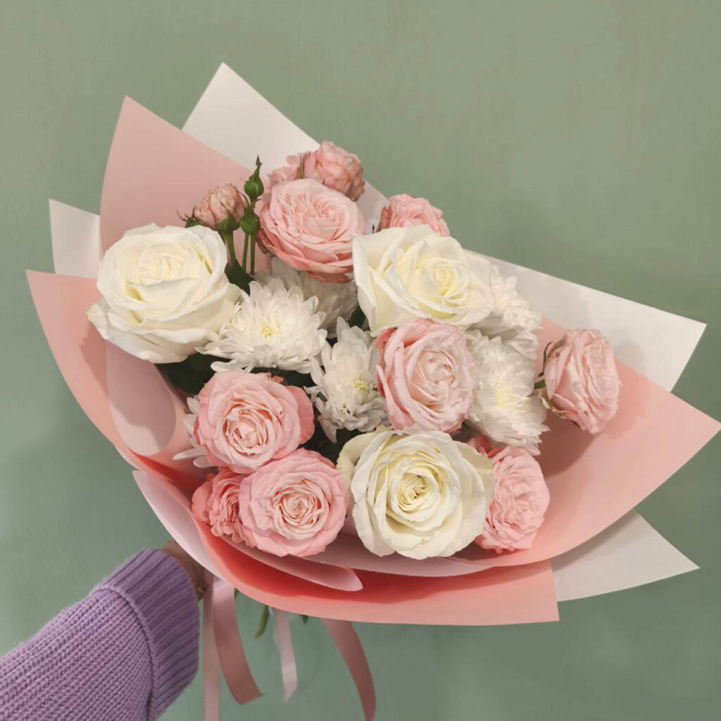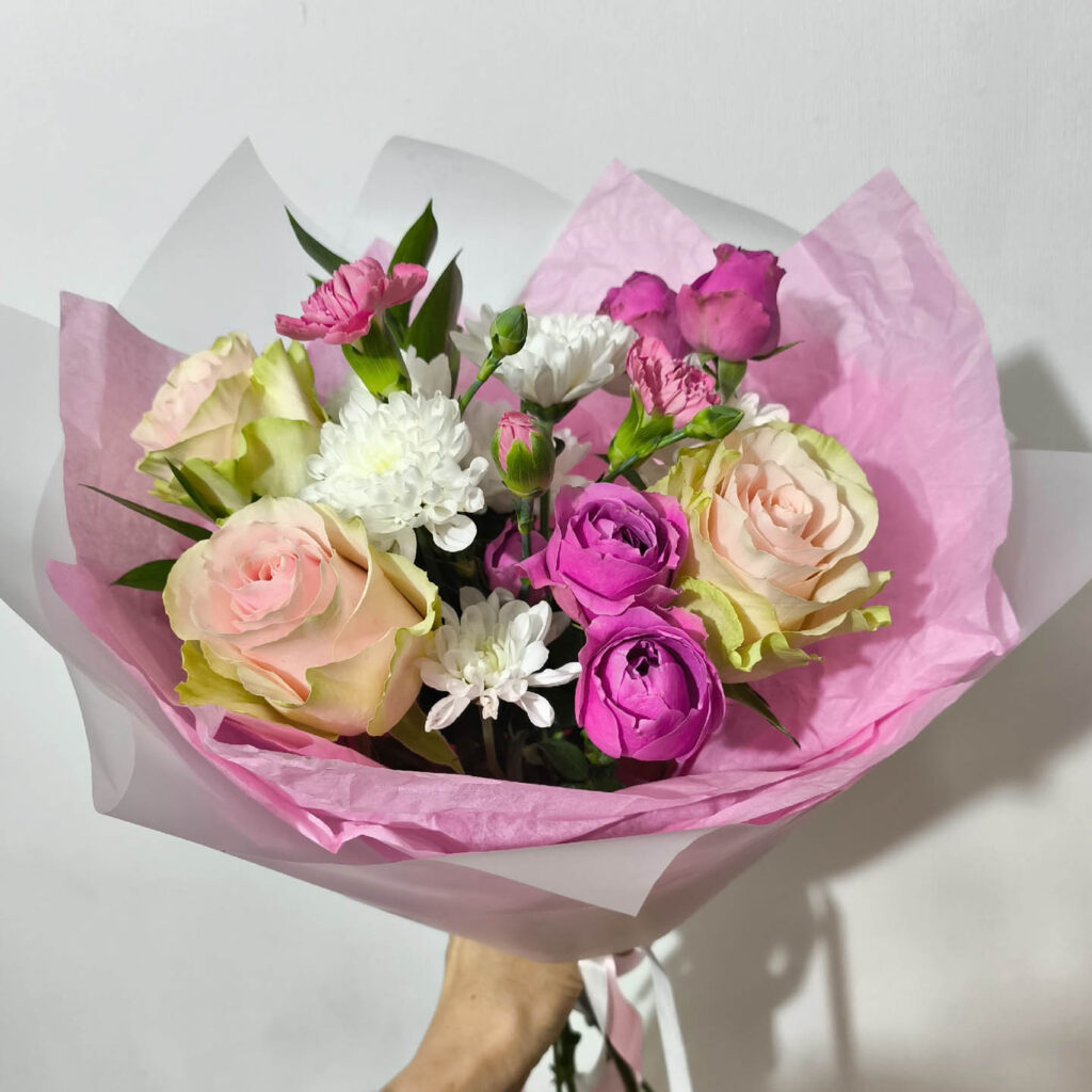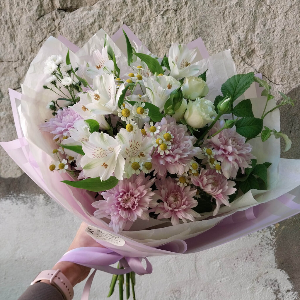 Состав букета: хризантема, кустовая роза, альстромерии, диантусы. От 3 500 Р