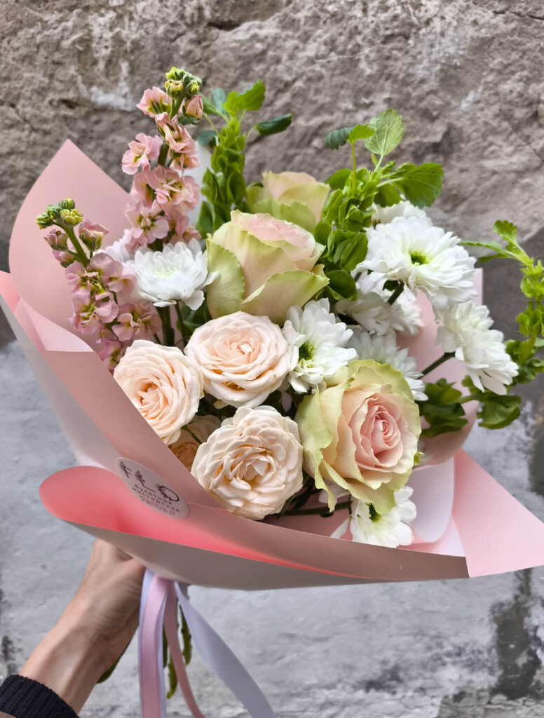 Состав композиции: роза кустовая, роза, хризантема, диантусы, матиола. 3 500 Р
